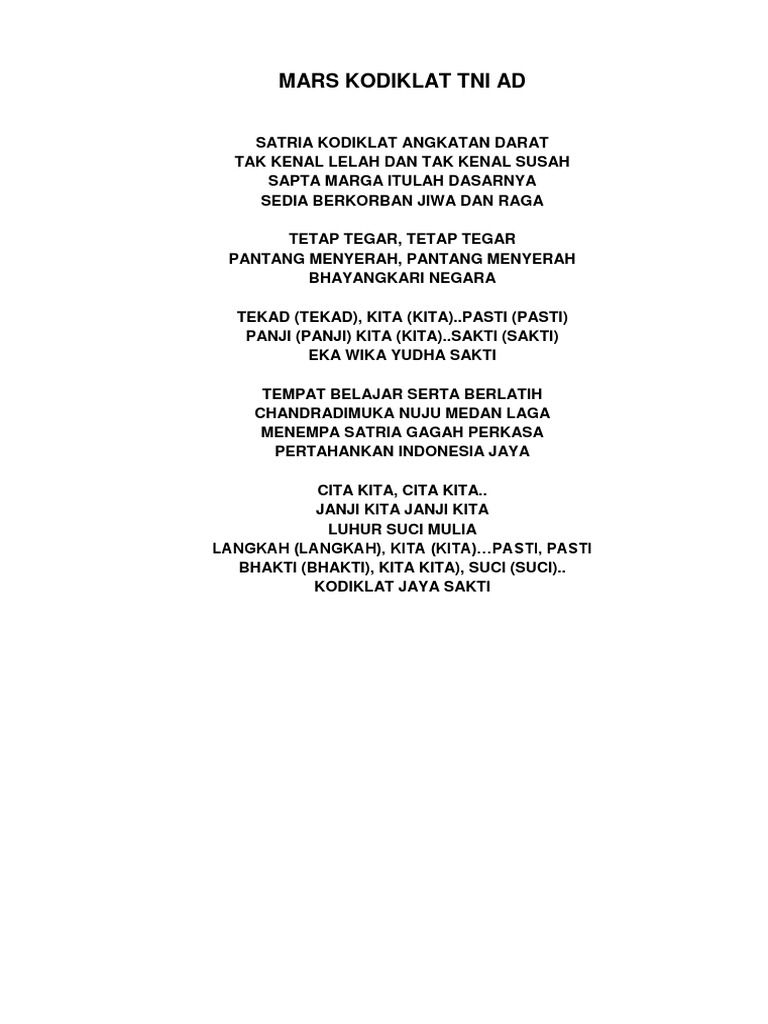 Hasian unang mura-mura ho muruk. Semoga lirik diatas dapat memudahkan teman-teman semua dalam menghafalkan Lirik Mars TNI AD Angkatan Darat. Sapta Marga tetaplah pedomannya.